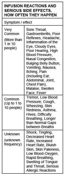 Side effects were mainly seen while patients were being given the medicine or shortly after (“infusion reactions”). The most serious side effects were swollen face and fever (very common); longer than normal gaps between breaths, difficulty breathing, asthma and hives (common); swelling of the tongue and throat, and serious allergic reaction to this medicine (unknown frequency).