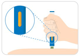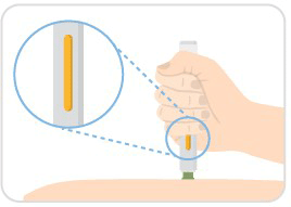 - Hold the auto-injector against your skin until the yellow indicator fills the medication window and stops moving.