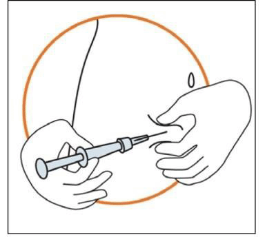 - Keeping the syringe in one hand, use your other hand to gently hold a fold of skin between your thumb and fingers at the previously disinfected injection site.
