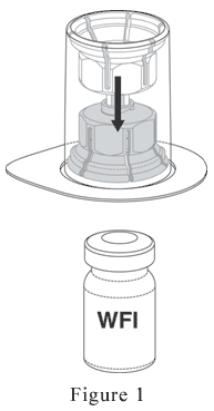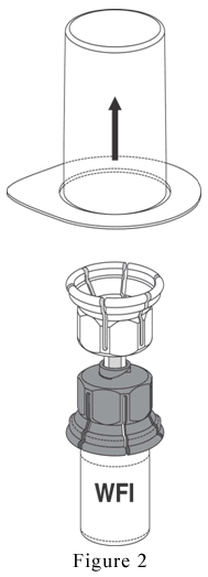 - While holding onto the vial of Water for Injections, carefully remove the outer package from the Mix2Vial™, being careful to leave the Mix2Vial™ firmly attached to the vial of Water for Injections, see Figure 2. Make sure that you only remove the outer package and not the Mix2Vial™.