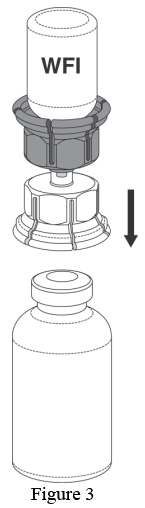- With the MonoFIX®-VF vial held firmly on a level surface, invert the Water for Injections vial with the Mix2Vial™ attached and push the transparent plastic cannula end of the Mix2Vial™ firmly through the stopper of the MonoFIX®-VF vial, see Figure 3. The water will be drawn into the vial by the vacuum contained within the MonoFIX®-VF vial. If water is not drawn into the vial, it means that there is no vacuum in the vial and the seal may be faulty. Do not use the product but return it to your haemophilia treatment centre or Australian Red Cross Lifeblood.