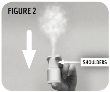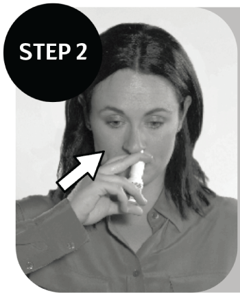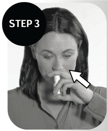 Swap the bottle to hold it in your LEFT hand and carefully insert the nasal applicator tip into the RIGHT nostril forming the other half of the ‘X’. With the applicator tip in your nostril, aim in the direction of the inside corner of your RIGHT eye. Spray while inhaling normally.