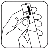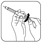 - Holding the pen with the needle pointing upward, gently tap the cartridge holder to move any air bubbles to the top. While still holding the pen in the upright position, push in the black dose knob until it clicks into position. You should see a drop of solution appear.