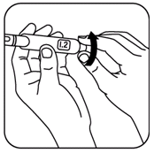 - If no drop of medicine appears, push the white reset button again. Now turn the black dose knob clockwise (see illustration) by one click (0.1 mg). If you accidentally turn it too far, go back one click (0.1 mg).